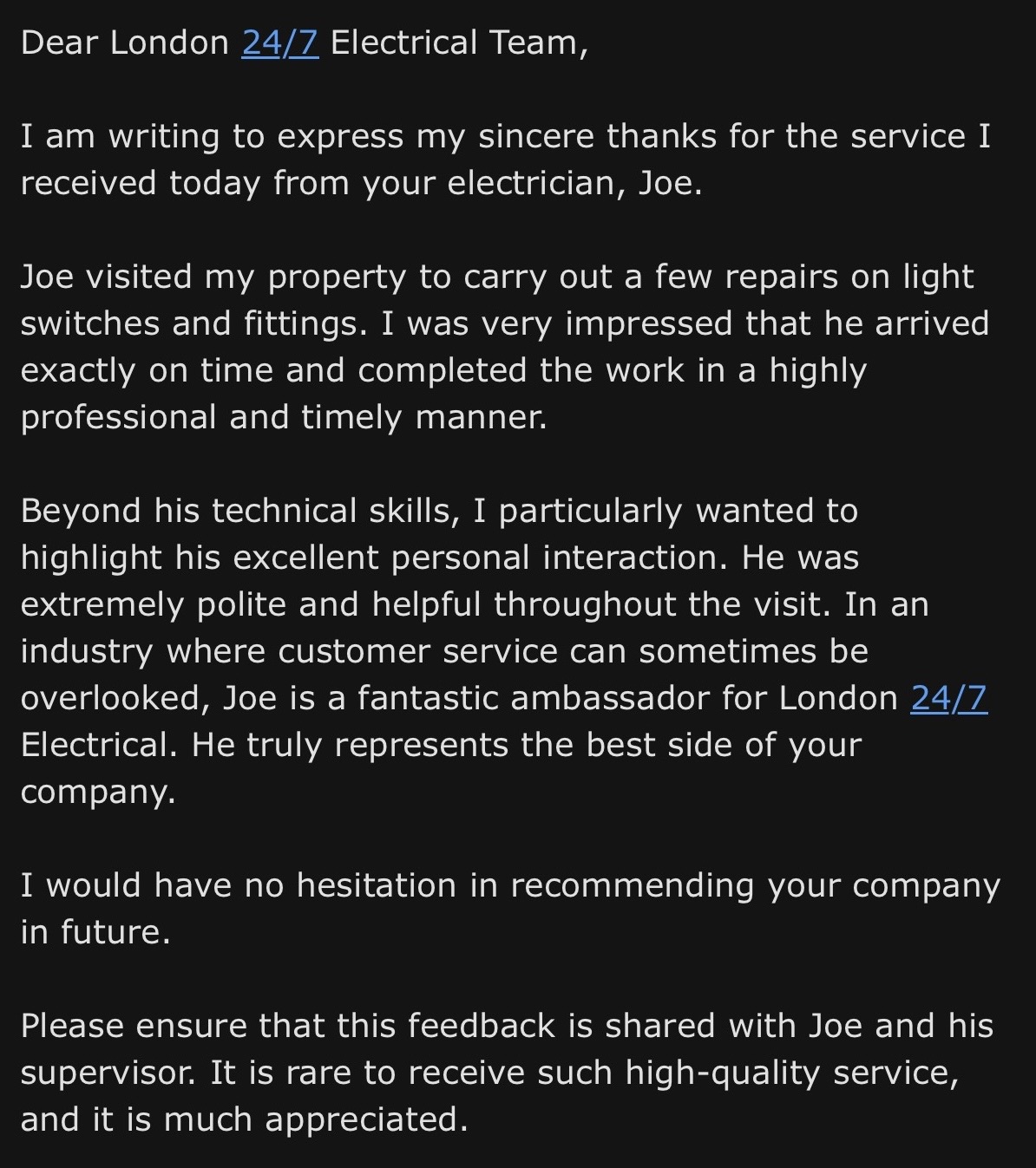Welcome back Joe. First day at work in a few weeks and we get a lovey email like this. That you to our customer in CR8 if you read this. We appreciate you and all our lovely customers!